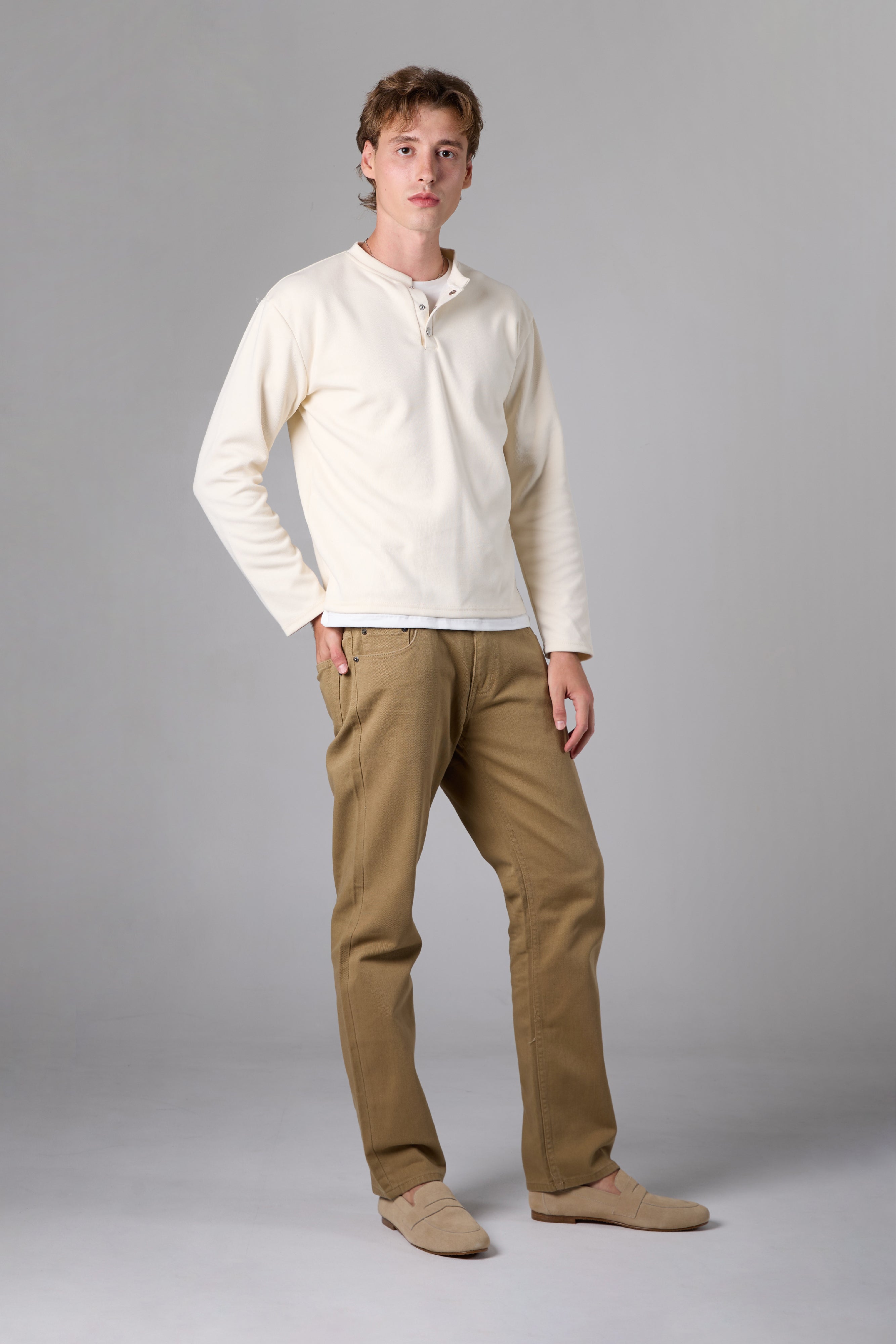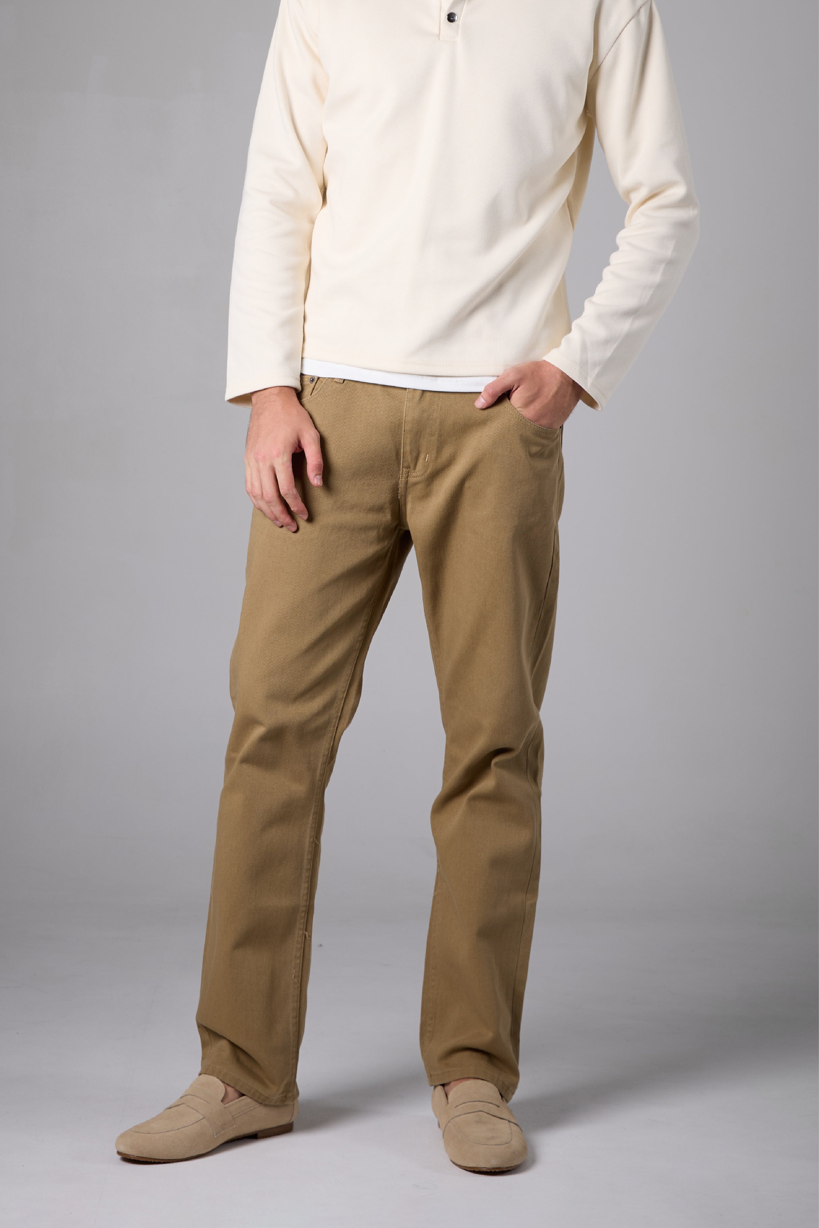 The JACK RUSSEL Men Chino Straight Fit Model J-1191 in Khaki offers both comfort and style for men who value durability. These Men Chino Straight Fit pants feature a roomy, straight-leg cut that provides a relaxed yet polished look. As a result, they’re suitable for a variety of occasions. Made from 100% cotton, the fabric feels sturdy and natural, ensuring all-day comfort.