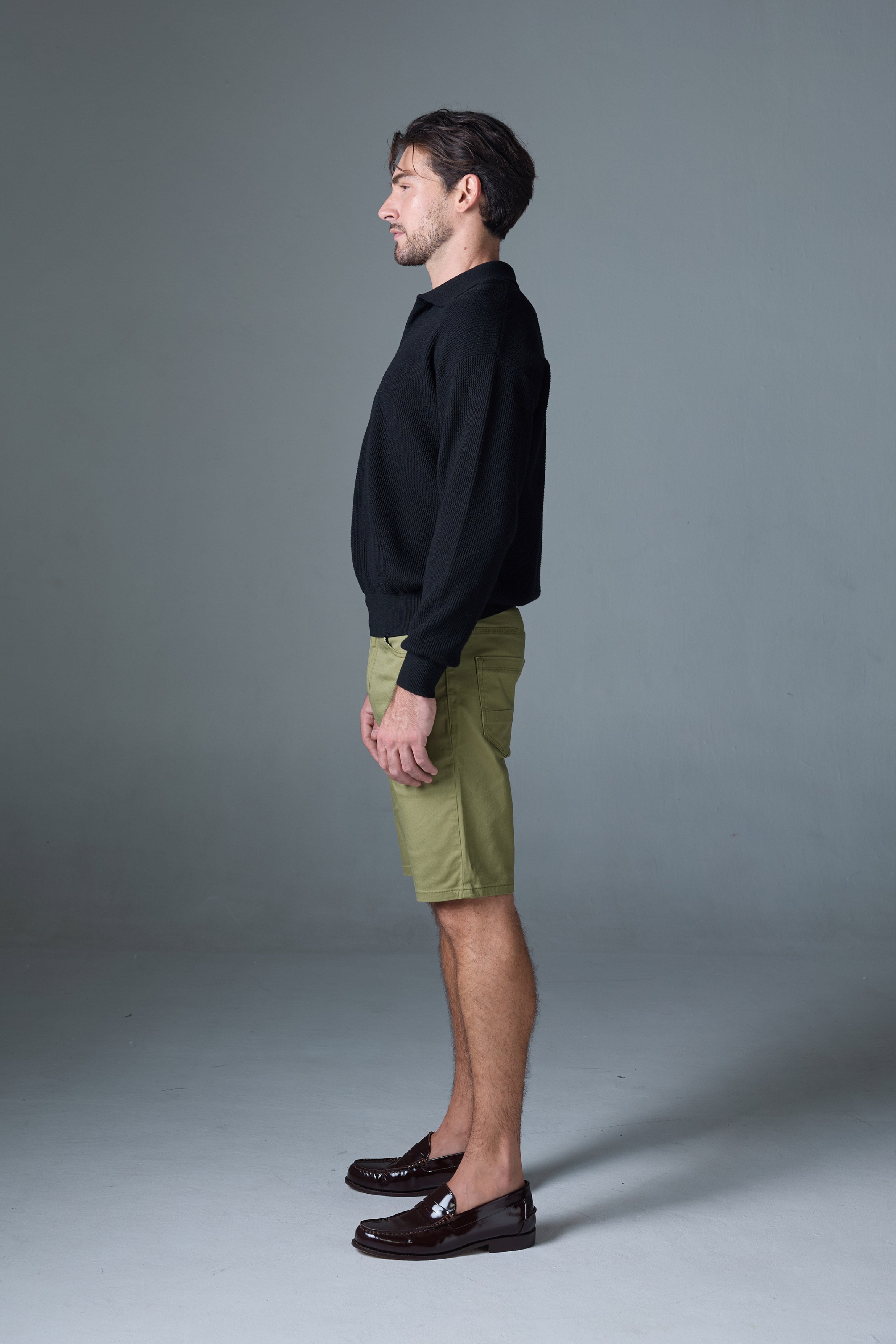 The fabric is a high-quality 3/1 twill (C20xC10, 108x56 Lafer) and weighs 11 oz. Consequently, the shorts offer the perfect balance between structure and softness. In addition, the secure zipper fly adds functionality and a modern edge.